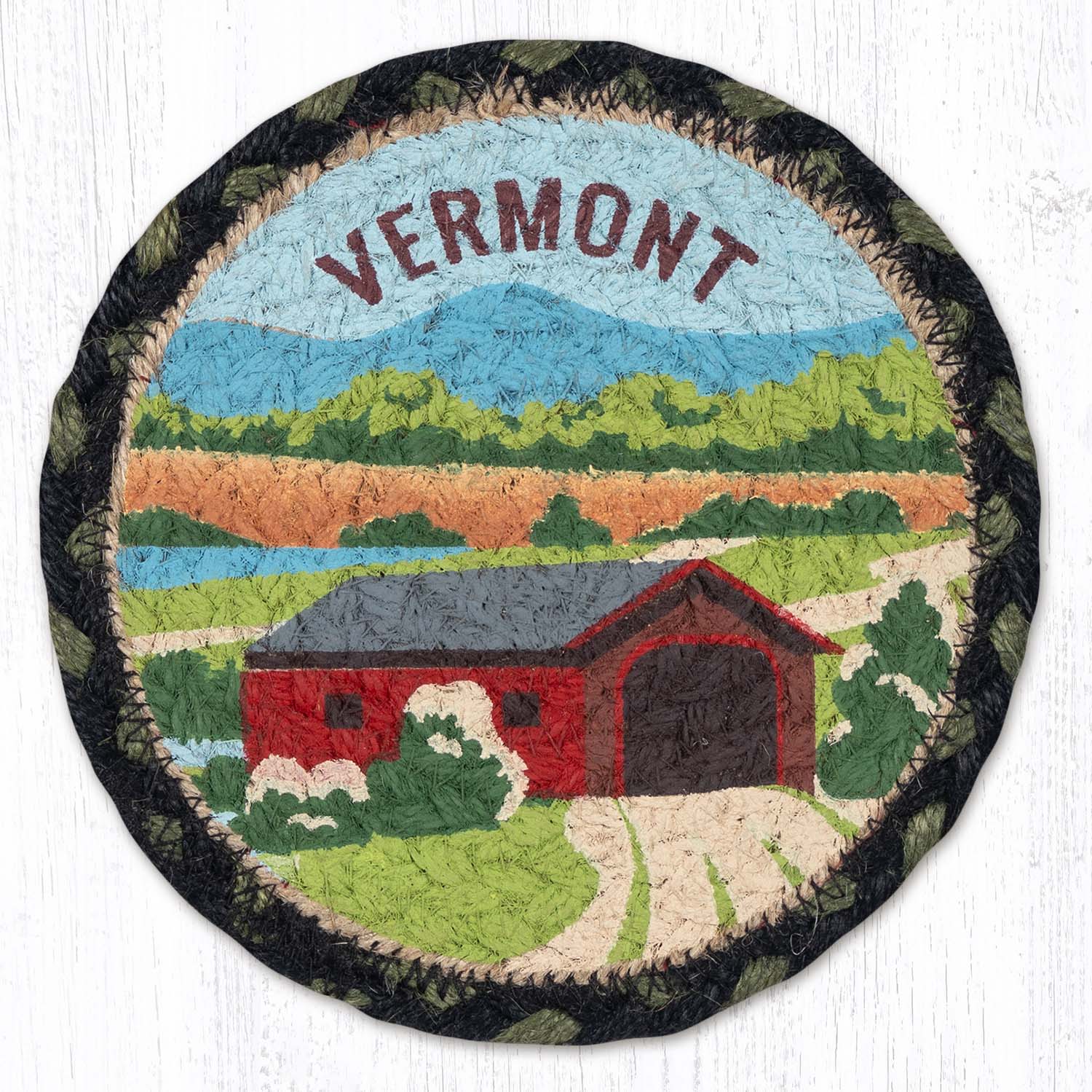 7" Round Hand Stenciled Coaster with Vermont Covered Bridge Design